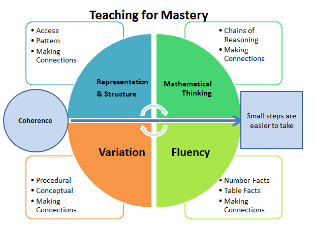 The maths curriculum is divided into different areas called domains which are taught and revisited across the year, and built upon as the children progress through the school. This enables children to become fluent in the fundamentals of mathematics, reason mathematically and solve problems through the application of mathematics. Maths is taught through the mastery approach which is underpinned by the Five Big Ideas which are shown below.