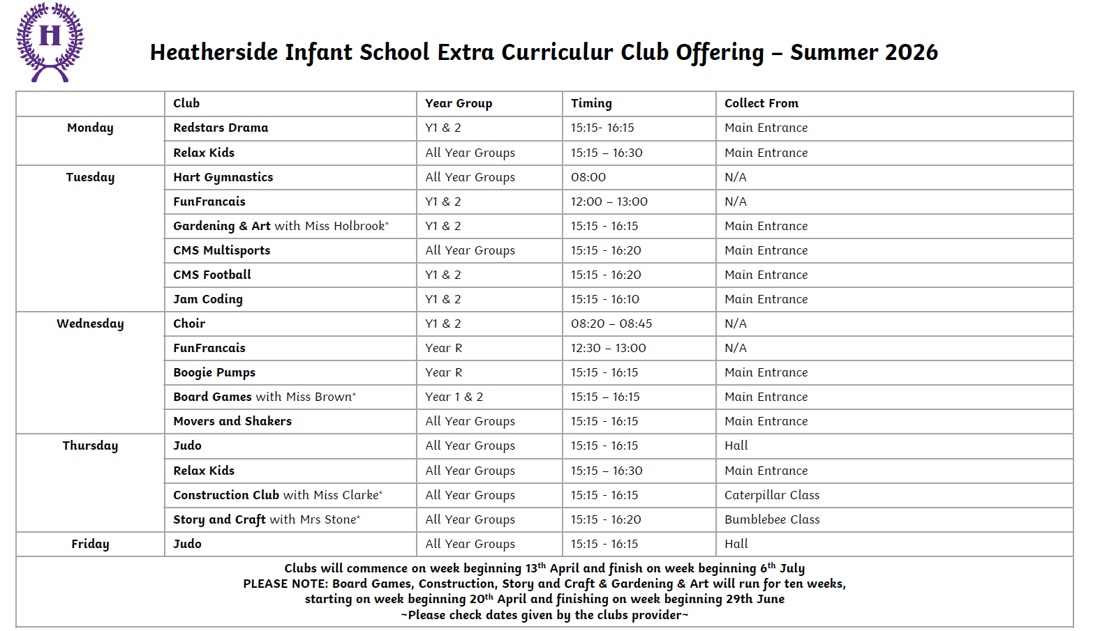 Details of all extra curricular school clubs are published on our website near the end of each term to allow places to be booked for the following term.